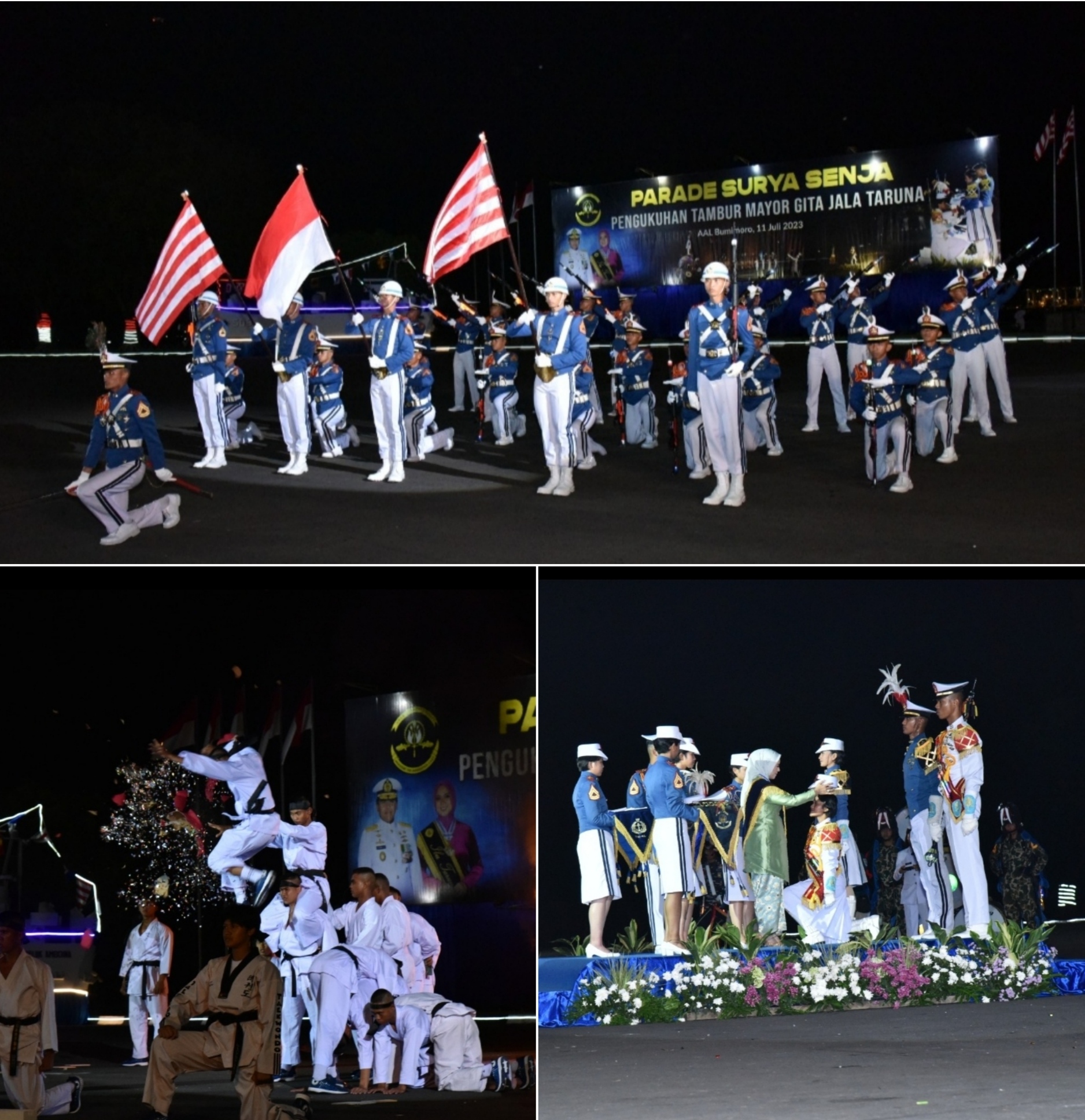 Parade Surya Senja (PSS) dalam rangka serah terima jabatan Tambur Mayor Genderang Suling Gita Jala Taruna Akademi Angkatan Laut (AAL) dilaksanakan pada hari Selasa, 11 Juli 2023 di Lapangan Arafuru, Kesatrian AAL, Bumimoro, Surabaya.