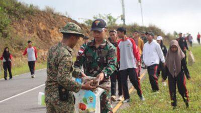 [KAPUAS HULU] – BUSERJATIM.COM – Personel Satgas Pamtas RI-Malaysia Yonarmed 19/105 Trk Bogani melaksanakan kegiatan kerja bakti membersihkan lingkungan bersama siswa-siswi SMK 1 Badau dalam rangka untuk menjaga dan melestarikan hidup sehat tanpa sampah di sepanjang jalan poros Kecamatan Badau, Kabupaten Kapuas Hulu, Kalimantan Barat. Sabtu, 04 Februari 2023.