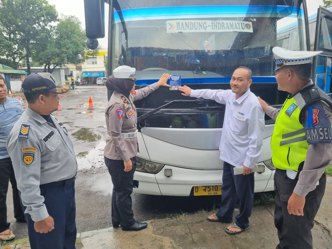 Indramayu,- Dalam rangka menjaga keselamatan lalu lintas dan menciptakan kondisi lalu lintas yang tertib, Satuan Lalu Lintas (Satlantas) Polres Indramayu jajaran Polda Jabar melaksanakan kegiatan pemasangan leaflet/sticker Ops Keselamatan Lodaya 2024 kepada pengemudi angkutan umum/bus.