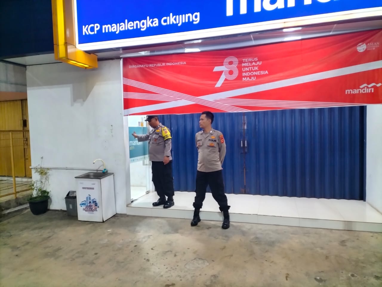 Majalengka – Untuk memberikan Pengamanan pada Obyek Vital yang ada di wilayah hukum Polsek Cikijing, Personil Polsek Cikijing Polres Majalengka Polda Jabar, Ps. Panit Samapta l Aipda Eman Subagja dan Bripka Adhi melaksanakan Patroli Mobiling ke Bank Mandiri KCP Cikijing, Minggu (13/08/2023) dini hari.