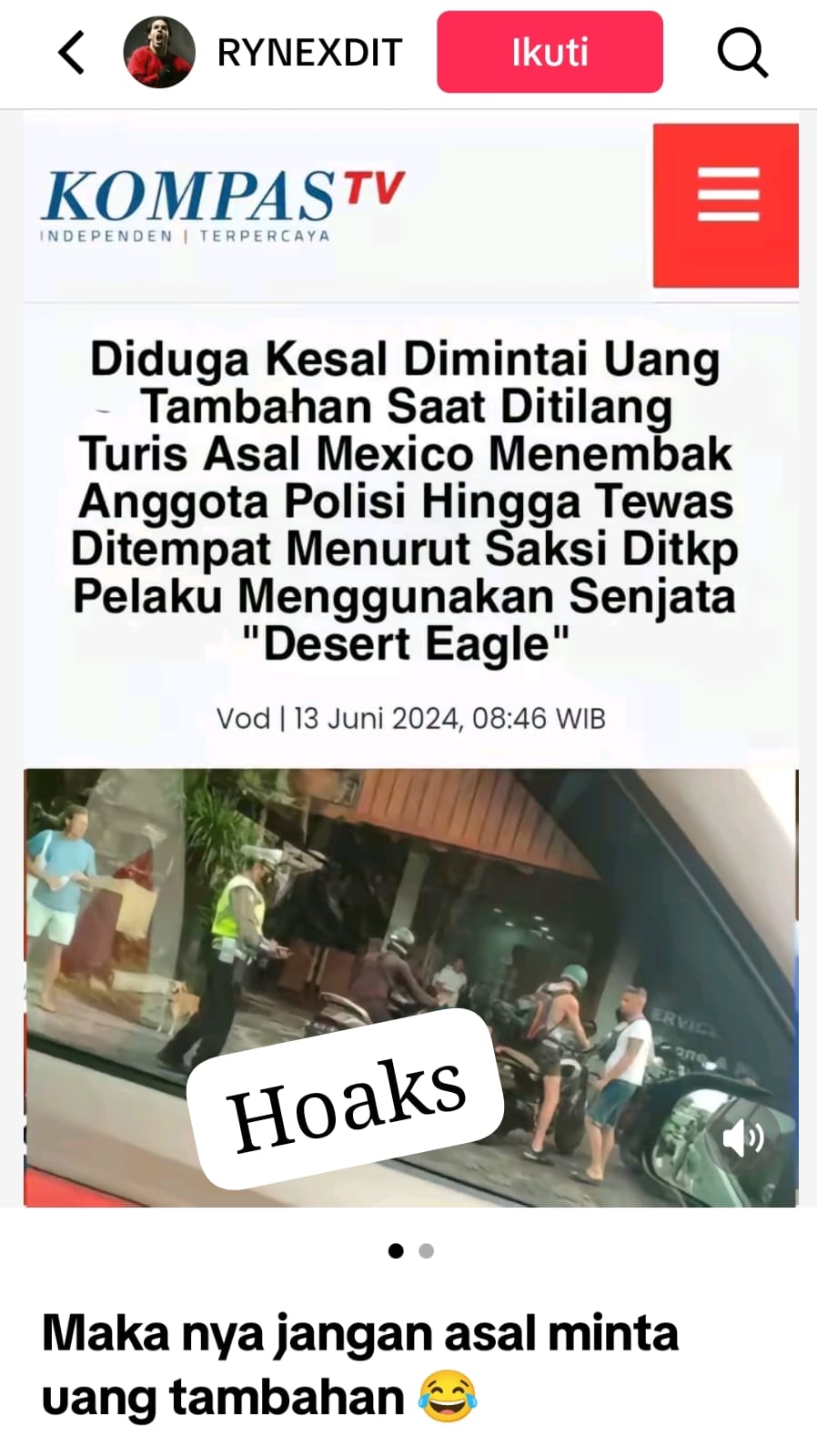 Dimana berita viral di Medsos tersebut berlogo Kompas TV dan berjudul “Diduga kesal diminta uang tambahan saat ditilang turis asal mexico tembak anggota Polisi hingga tewas, menurut saksi di TKP pelaju menggunakan senjata Desert Eagle”