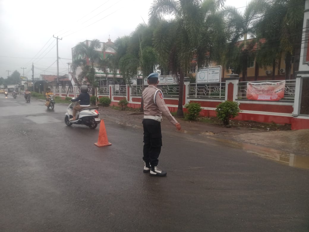 Personel Polsek Gabuswetan terlihat berdiri tegap di tengah hujan, memastikan arus lalu lintas di beberapa ruas jalan utama tetap berjalan lancar dan aman. Kehadiran mereka sangat membantu para pengendara, terutama saat kondisi jalan licin dan jarak pandang terbatas akibat hujan.