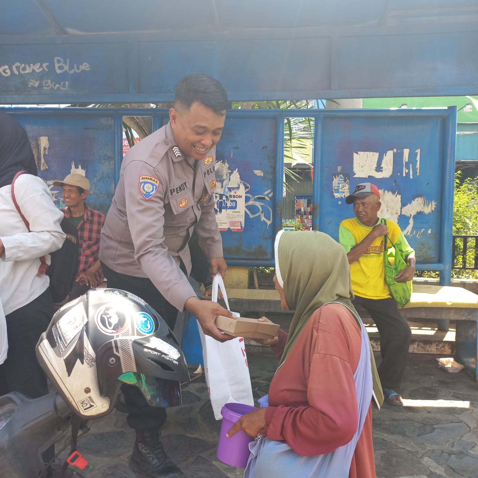 Bhabinkamtibmas kelurahan kejaksn Bripka Pendi bagikan nasi kotak , terapkan indahnya berbagi kepada dhuafa, dan tukang becak, juru parkir di jalan Kartini, Senin (14/10/2024).