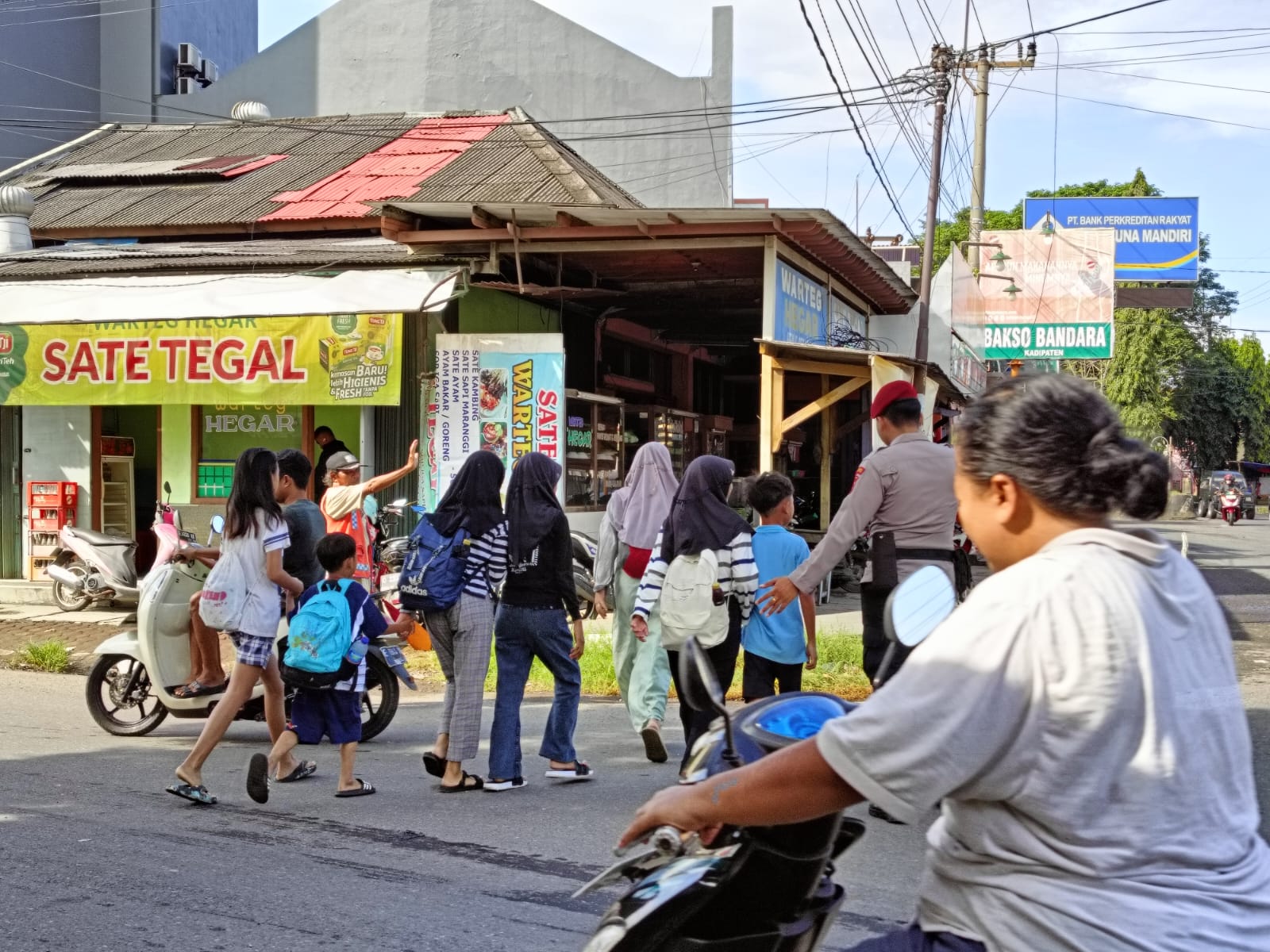Mereka dengan sigap membantu menyeberangkan Warga yang hendak menyeberang jalan di depan Pos Gatur Kadipaten, memastikan mereka melintas dengan aman.