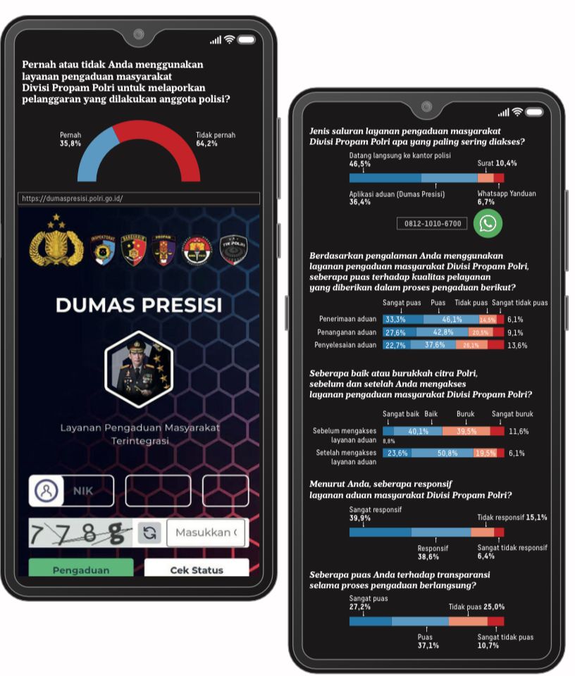 Pada pelayanan *DUMAS PRESISI* tersebut di gambarkan dari hasil *Jajak Pendapat* oleh *Litbang Kompas* kepada 1.005 Responden Nasional pada Pertengahan Juni 2024 Lalu dengan hasil Surveri merekam ada sekitar 35,8 persen Responden yanv mengaku pernah menggunakan layanan pengaduan laporan masyarakat tersebut terkait pelanggaran tindakan yang menyimpang anggota Polri dan hasil dari Responden yang datang langsung melaporkan ke kantor polisi sekitar 46,5 persen, dan ada sekitar lebih dari 36,4 persen Responden mempercayakan aduan serta laporan nya memilih memanfaatkan aplikasi layana aduan laporan pengaduan melalui digital, dan juga ada yang melalui surat ataupun via whatsup.
