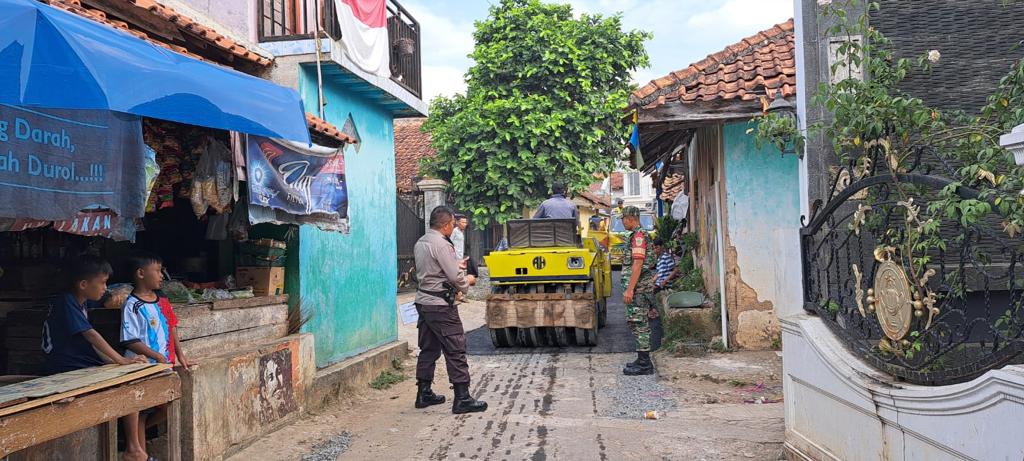 Wujud Sinergitas TNI-Polri, Polsek Ciampea Polres Bogor Monitoring Pengaspalan Jalan Desa Cihideung Udi