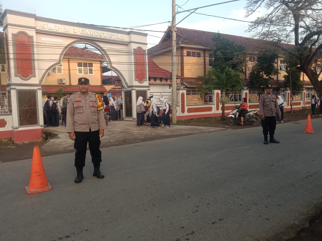 Seperti yang terlihat, Unit Lalu Lintas Polsek Gabuswetan melakukan pengaturan Lalu Lintas (Gatur lantas) dan membantu menyeberangkan pelajar yang akan ke sekolah.