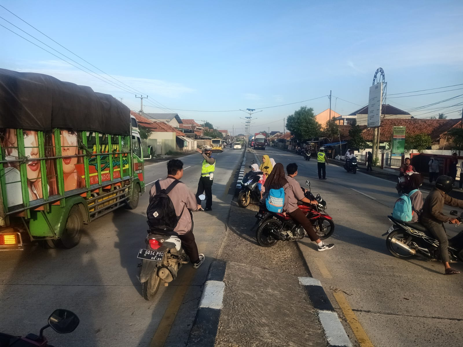 Seperti yang terlihat, Unit Lalu Lintas Polsek Kandanghaur melakukan pengaturan Lalu Lintas (Gatur lantas) dan membantu menyeberangkan pelajar yang akan ke sekolah.