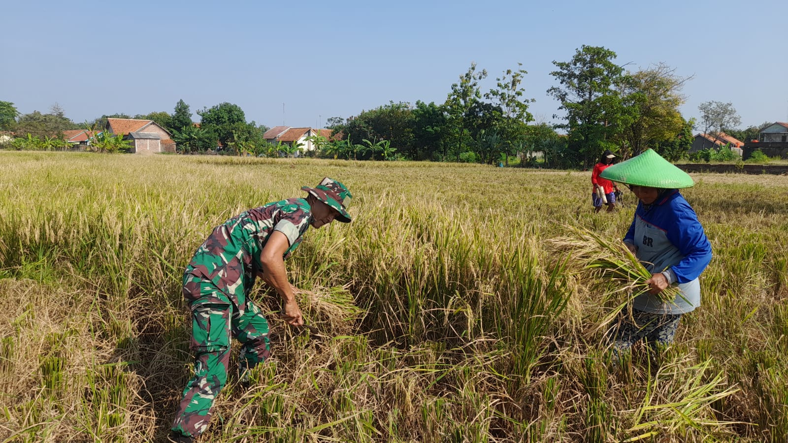 Majalengka || Babinsa Koramil 1712/Jatiwangi Kodim 0617/Majalengka Serda Rofik terjun langsung membantu panen raya padi bersama para petani, yang berlokasi di Dusun 05 Desa Ciborelang, Kecamatan Jatiwangi, Kabupaten Majalengka, Selasa (30/7/2024).