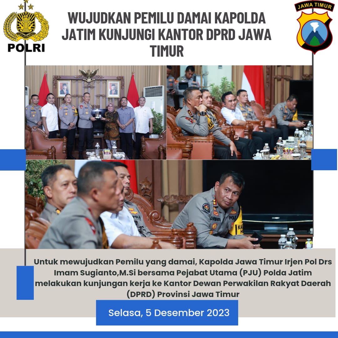 Untuk mewujudkan Pemilu yang damai, Kapolda Jawa Timur Irjen Pol Drs Imam Sugianto,M.Si bersama Pejabat Utama (PJU) Polda Jatim melakukan kunjungan kerja ke Kantor Dewan Perwakilan Rakyat Daerah (DPRD) Provinsi Jawa Timur pada Selasa (5/12/2023).